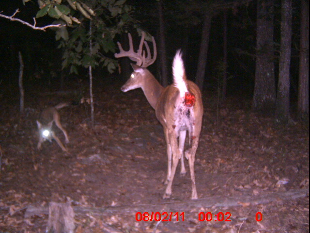 We’ll never know exactly why this magnificent buck decided to stay in front of Marlin Smith’s trail camera for more than five hours during the night of Aug. 1 and 2, 2011. We can only speculate that he might have been completely exhausted from being chased for who-knows-how long beforehand and that clearing in the woods was the only place where he felt safe enough to try to fend off their ferocious attack.