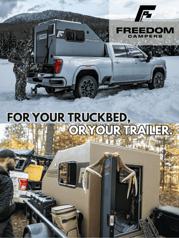 Unlike bulky, traditional campers, the Freedom Camper offers compact mobility that doesn’t limit where you can go — or what you can do when you get there. It’s ideal for pre-season scouting trips, overnight hunts, weekend camping, and extended road adventures. The Freedom Camper is available in four size configurations; 48” x 79” (midsize trucks), 58” x 79”, our best seller, the 58” x 89” (full size trucks and 5×8 trailers or larger), and our largest the 72″x89″ (flatbed trucks and 6′ or wider trailers).
