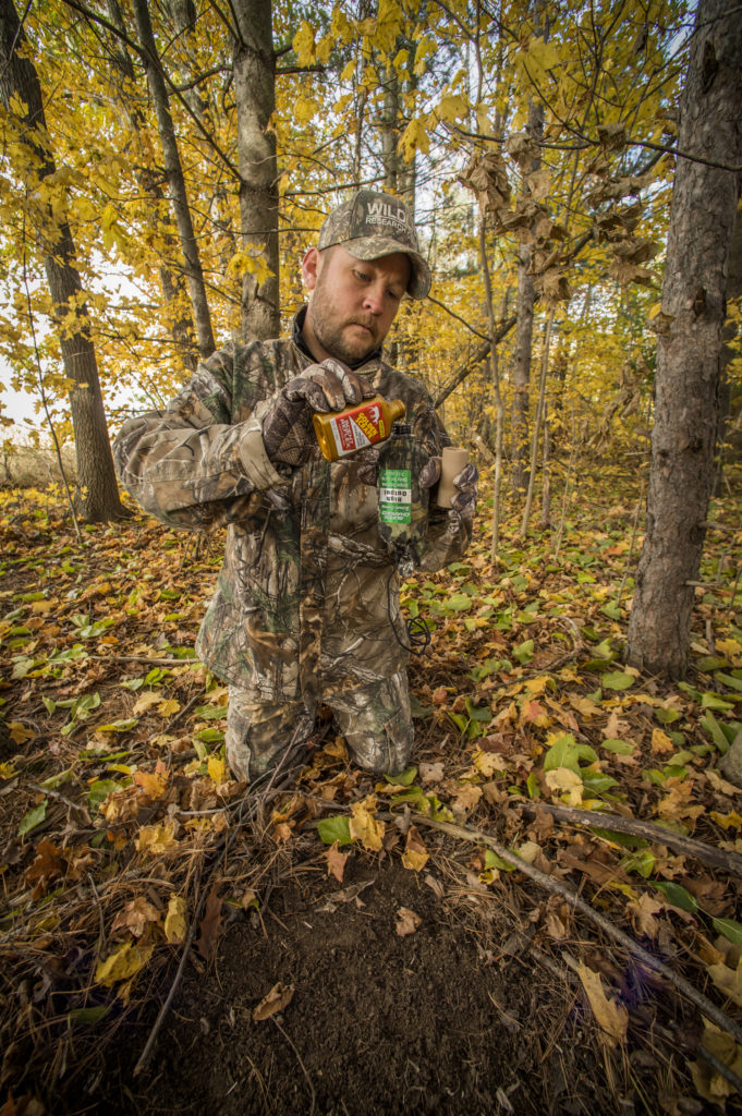 The actual mock scrape on the ground is best created with a sturdy stick found in the area. Try to make the scrape on flat ground (if possible) and make sure it is free from all debris. The ground scrape ranges in size from the diameter of a Frisbee on up to the hood of your pickup truck. I usually make it about 3½ feet in diameter. Aside from the scent you’ll be using, bucks are also drawn into the smell of the freshly disturbed soil. I believe the reason is “geosmin,” an organic compound created by soil microorganisms called “actinomycetes.” It’s what causes that “fresh dirt smell” and exists in the top couple inches of soil and decomposing forest litter where most of microorganism activity occurs.