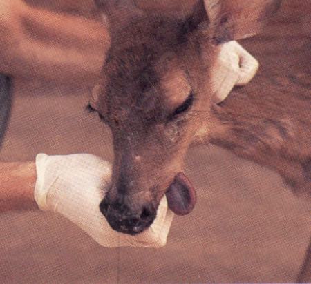 Often, infected animals will be found lying around water sources with little fear of man or an inability to flee. The disease poses no health risk to humans, and while cattle can be infected, they rarely exhibit signs of disease.