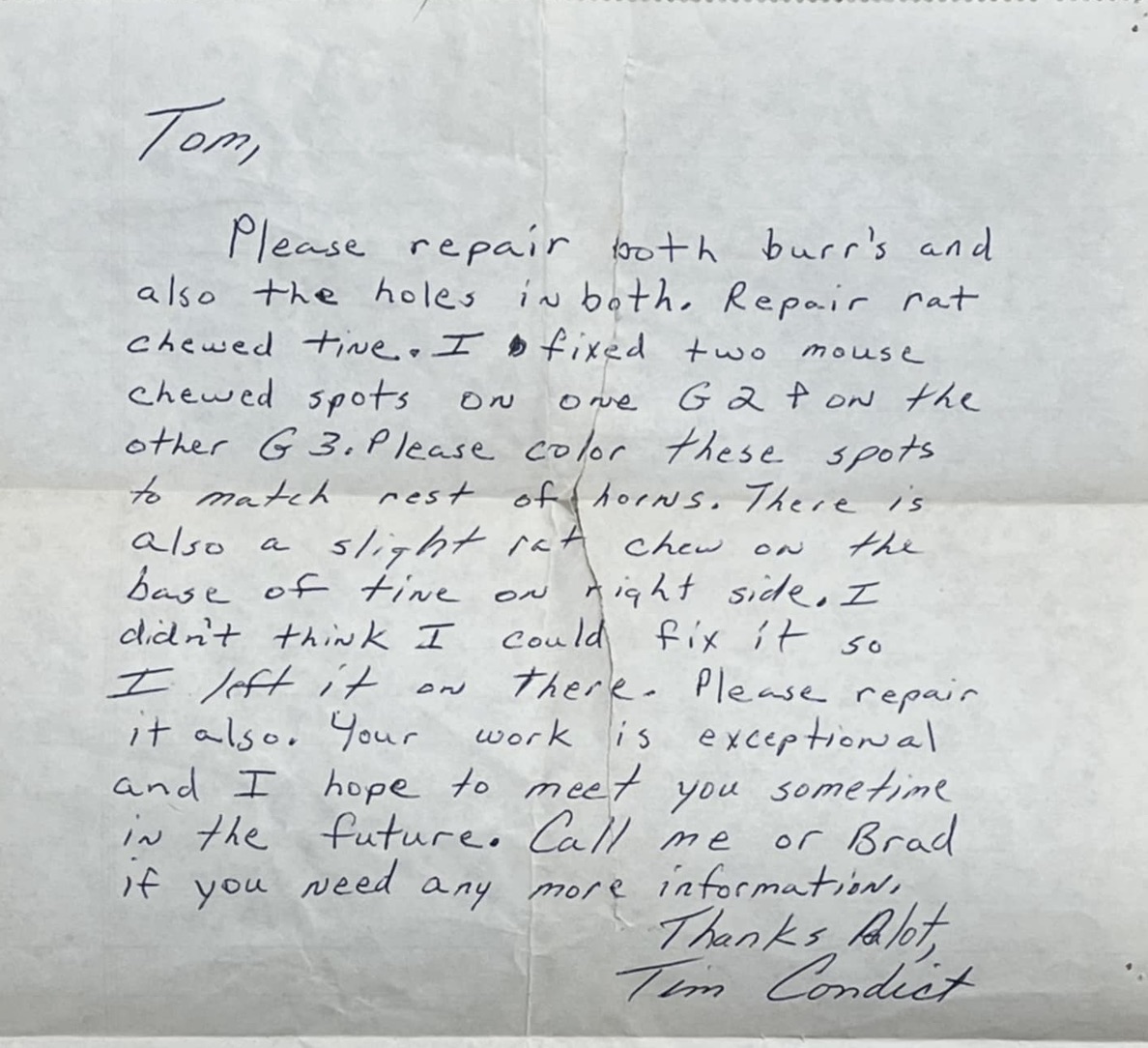 The undated letter from Condict describes the work he was asking Sexton to do. First, the burrs on both antlers needed repair because the back edges had been trimmed to fit them to the board they had been mounted on. Then, Condict said he “fixed two mouse chewed spots on one G2 + [plus] on the other G3.” He also asked Sexton to color-match the repairs and concluded with, “Call me or Brad [Gsell] if you need any more information.” The mention of Brad puts the letter on the ownership timeline of mid-1995 to early 1996. For unknown reasons, Gsell soon returned them to Condict.