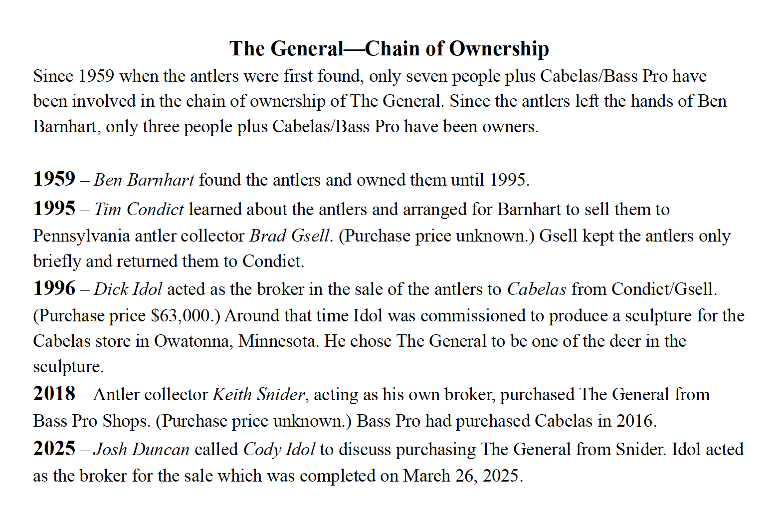 In the chain of ownership, we can be sure that no one at Cabelas, and not Dick Idol (who brokered them from Condict to Cabelas), Keith Snider, Cody Idol, or Josh Duncan (nor the many antler experts who had seen them through the years) had any idea the antlers had been altered.