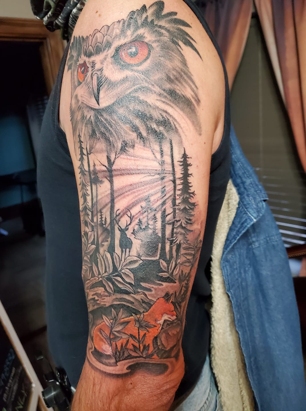 A wise owl and sly fox add unique details to this nature-themed tattoo. Photo by Werner Barz.
