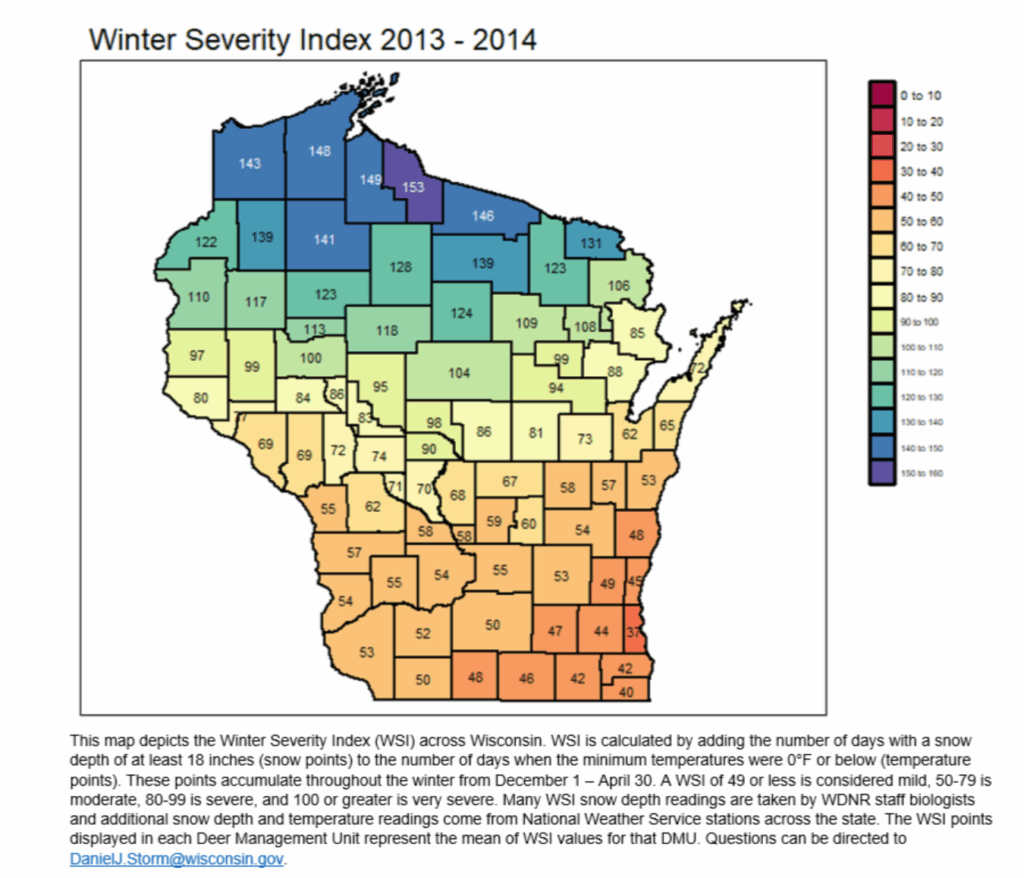 “Prior to 1975, Wisconsin did not have a formal procedure for measuring winter severity and predicting its impact on deer herds. Michigan had developed a severity index that used calorimeters to estimate a winter air-chill factor, and snow depth and sinking-depth measurements to estimate a snow-hazard factor (Verme 1968). The air-chill and snow-hazard factors were summed at the end of each week to derive a cumulative severity index. Ontario was using the Passmore-Hepburn Method, which also involved collecting relatively complex snow measurements (Passmore and Hepburn 1955). Our winter severity index (WSI) was developed after testing several procedures for quantifying winter conditions (Kohn 1975). It used the number of days with a minimum temperature of 0°F as a measure of winter air-chill, and the number of days with 18 inches of snow on the ground to estimate the snow hazard. Days when both conditions occurred are scored as 2. These are added together from 1 December through 30 April to obtain the WSI.”