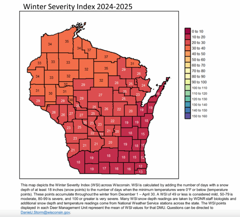 Research biologists in Minnesota and Wisconsin set out to learn more about winter’s wrath on the whitetail herd. During their studies, the researchers found a direct link between snow depth, wind-chill temperatures and winter dieoffs among whitetails. They also came up with a formula for predicting how bad any given winter would have on the deer herd. It’s called the “Winter Severity Index.” Here’s how it came to be, according to the Wisconsin Department of Natural Resources: