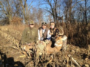 The morning came and we slowly started walking to where Brandon had seen the buck in the corn field. On the walk in we spooked two 160″+ bucks with does in the draw close to the same stand Brandon had just shot his buck the night before. We walked just a little bit further and piled up in the corn field, right before the timber, lay Brandon’s buck.